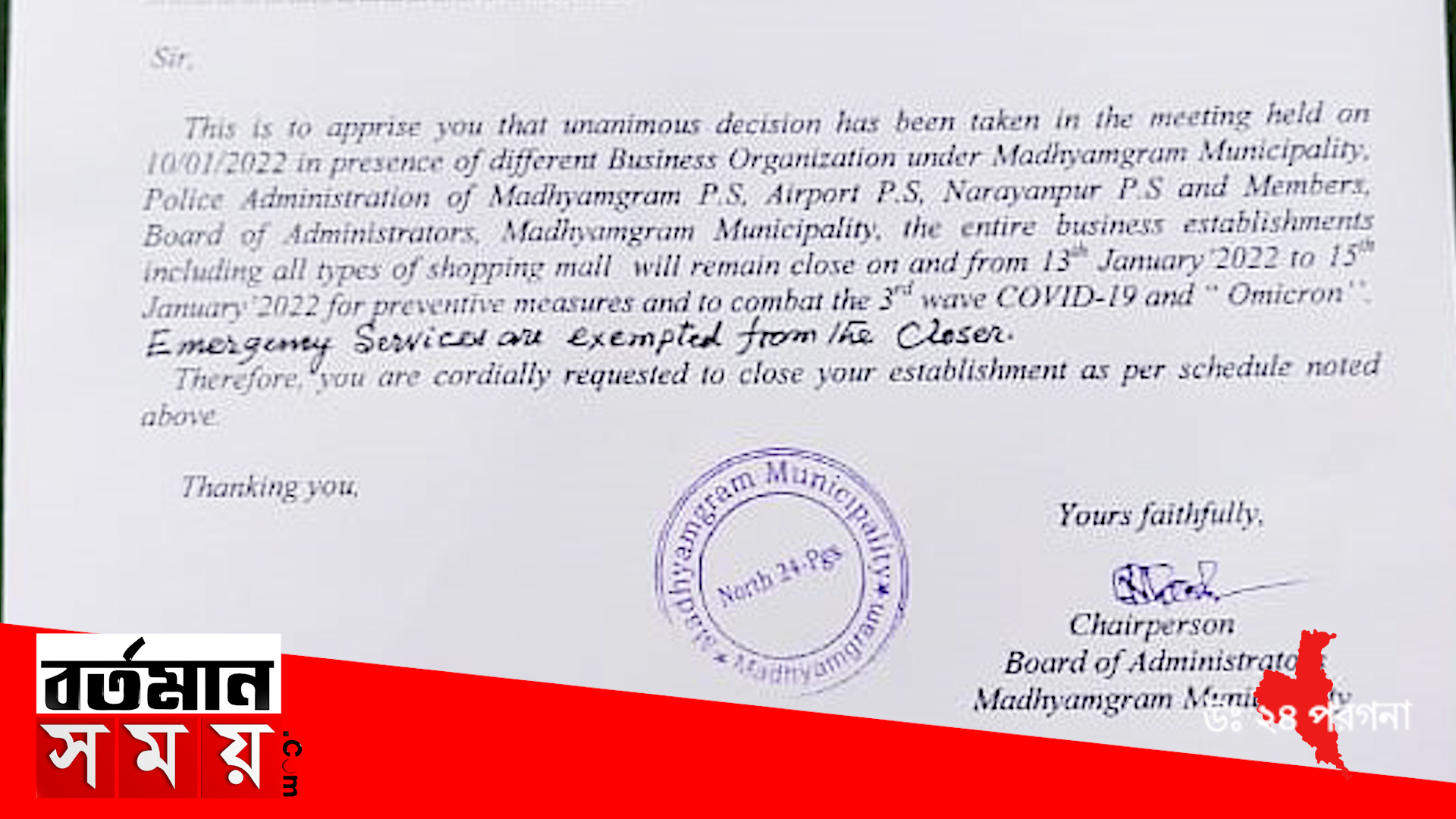 আগামী ১৩,১৪ ১৫ তারিখ মধ্যমগ্রাম পৌরসভা অঞ্চলে লকডাউন।