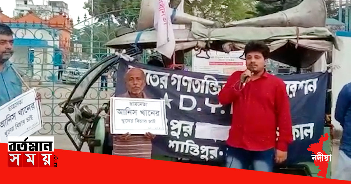 ছাত্রনেতা আনিস খানের মৃত্যুর সঠিক তদন্ত এবং দোষীদের শাস্তির দাবিতে এবং যুবনেতা বিদ্যুৎ মন্ডল খুনের ঘটনায় দোষীদের শাস্তির দাবিতে সারা রাজ্যব্যাপী যে অবস্থান বিক্ষোভ কর্মসূচি ডিওয়াইএফআই ডাক দিয়েছিল সেই মোতাবেক নদীয়ার শান্তিপুর থানার সামনে অবস্থান বিক্ষোভ করলেন ডিওয়াইএফআইয়ের কর্মী-সমর্থকরা তারা জানান আনিস খান এবং বিদ্যুৎ মন্ডল এর মৃত্যুর সঠিক তদন্ত করা হোক এবং দোষীদের দৃষ্টান্তমূলক শাস্তির ব্যবস্থা করুক প্রশাসন । আজ বিকেল আনুমানিক পাঁচটার সময় এই অবস্থান বিক্ষোভ শুরু করেন ডিওয়াইএফআই সমর্থক রা শান্তিপুর থানার সামনে ।