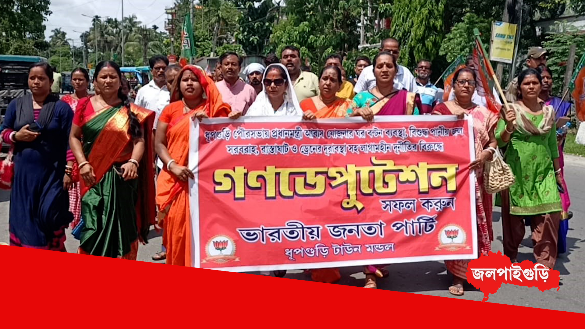 বুধবার ধূপগুড়ি টাউন মন্ডল বিজেপির পক্ষ থেকে ধুপগুড়ি পৌরসভায় সাত দফা দাবিতে গণ ডেপুটেশন প্রদান করা হয়।এদিন দুপুরে দলীয় কার্যালয় থেকে মিছিল করে বিজেপি কর্মী সমর্থকরা পৌরসভা অভিযান করে। এদিনের কর্মসূচিতে উপস্থিত ছিলেন, বিজেপির জলপাইগুড়ি জেলা সভাপতি বাপি গোস্বামী।এছাড়াও এদিন উপস্থিত ছিলেন ধূপগুড়ির বিধায়ক বিষ্ণুপদ রায়,টাউন মন্ডলের সভাপতি দেবব্রত চক্রবর্তী,সহ সভাপতি বাবুল চৌধুরী,বিরোধী পুরসভার বিরোধী দলনেতা কৃষ্ণদেব রায় সহ বিজেপি কর্মীরা।পুরসভার ভাইস চেয়ারম্যানের হাতে ডেপুটেশন তুলে দেওয়া হয়।প্রধানমন্ত্রী আবাস যোজনার ঘর বন্টন,বাড়ি বাড়ি পানীয় জল,ড্রেনের দুরবস্থা সহ একাধিক দাবিতে গণ ডেপুটেশন দেওয়া হয়।চেয়ারম্যানকে অন্ধকারে রেখে তৃণমূল কাউন্সিলরা লুটে পুটে খাচ্ছে।ঘরের টাকা,বিভিন্ন কেন্দ্রীয় প্রকল্পের টাকা লুট করা হচ্ছে বলে অভিযোগ করেন বিজেপি জেলা সভাপতি বাপি গোস্বামী,ইডি , সিবিআই তদন্তের দাবি তোলেন তিনি। যদিও পুরসভার ভাইস চেয়ারম্যান রাজেশ কুমার সিং অভিযোগগুলি ভিত্তিহীন বলে দাবি করেছেন।তিনি বলেন,কেন্দ্রীয় সরকার ঘরের বকেয়া টাকা আটকে রেখেছে।সেই বকেয়া টাকা মেটালেই সমস্ত ঘরের টাকা দেওয়া হবে।ভোটের আগে মিডিয়ার সামনে হাইলাইট হওয়ার জন্য এই ডেপুটেশন দিচ্ছে বিজেপি।তিনি আরো বলেন যদি কাউন্সিলরের টাকা লুট করে থাকে তাহলে তাদেরও তো চারজন কাউন্সিলর রয়েছে তারাও টাকা লুট করছে।