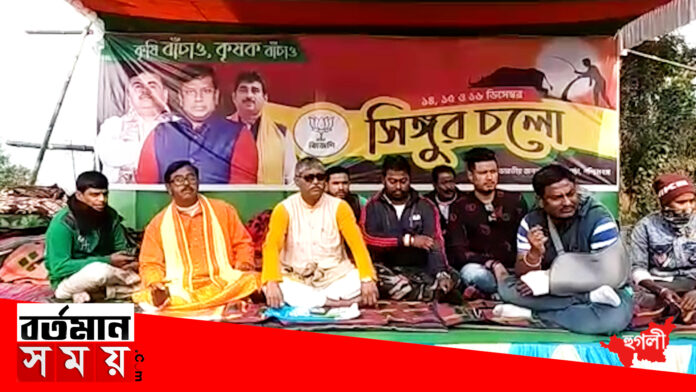 বিজেপির কিষাণ মোর্চার ডাকা ধরণার দ্বিতীয় দিন।মঙ্গলবার থেকে শুরু হয়েছে সিঙ্গুরে এই কর্মসূচী। রাজ্যের বিরোধী দলনেতা শুভেন্দু অধিকারী, সুকান্ত মজুমদার, দিলীপ ঘোষ সড় একাধিক নেতারা গতকাল সিঙ্গুরে এসেছিলেন।মঙ্গবার রাত থেকে বিজেপি কর্মীরা ঠান্ডায় তিনদিক খোলা মঞ্চে রাত কাটিয়েছেন।তৈরি করা হয়েছে ২০ ফুট বাই ৪০ ফুট সাইজের বড় মঞ্চ।সেই মঞ্চ থেকে রাজ্যের নেতারা বক্তব্য রাখবেন।
