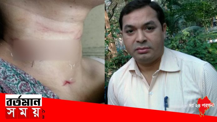 ঘটনাটি ঘটেছে শুক্রবার মধ্যরাতে নরেন্দ্রপুর থানা এলাকার লস্করপুর পেয়ারাবাগানে। ঘটনায় গ্রেফতার স্বামী রাজেশ ঝা ও ভাড়া করে আনা এক দুষ্কৃতী। পলাতক এখনও এক। এই ঘটনায় আক্রান্ত স্ত্রীর বক্তব্য গতকাল রাতে তার স্বামী রোজকার মত ঘরে ঢোকে, এরপর তার স্ত্রীর কাছ থেকে চাবি নিয়ে এদিন তিনি নিজেই গেটের তালা লাগাতে যান। গেটে তালা লাগাতে দেরি হচ্ছে দেখে গৃহবধূ দেখতে গেলে হঠাৎ করে এক জন দুষ্কৃতী তার মুখ চেপে ধরে। অপর আরেক দুষ্কৃতী ধারালো অস্ত্র নিয়ে তার দিকে তেড়ে আসেন। সে চিৎকার করতে থাকলে তাকে খাটে শুইয়ে তার গলায় ধারালো অস্ত্রের কোপ মারা হয়। তখন গৃহবধুর চিৎকারে আসেপাসের লোক জন ছুটে আসে। ধরা পড়ার ভয়ে পালিয়ে যাওয়ার চেষ্টা করে দুই দুষ্কৃতী ও তার স্বামী। তবে স্থানীয় মানুষজন এর তৎপরতায় একজন দুষ্কৃতীকে ধরে ফেলে তারা। তাকে জিজ্ঞাসাবাদ করে ও তল্লাশি চালিয়ে তার কাছ থেকে উদ্ধার হয় খড়দহ থেকে আসা লোকাল ট্রেনের টিকিট। গৃহবধূর অভিযোগ তাদের দুজনেরই মুখ ঢাকা অবস্থায় ছিল। এরপর স্থানীয় লোকজন ওই গৃহবধূকে গুরুতর অবস্থায় হাসপাতালে চিকিৎসার জন্য নিয়ে যায়। তার গলায় সাতটি সেলাই পড়ে। এরপর খবর দেওয়া হয় নরেন্দ্রপুর থানার পুলিশকে। পুলিশ এসে পাকড়াও হওয়া এক দুষ্কৃতী ও স্বামীকে গ্রেফতার করে নিয়ে যায়।